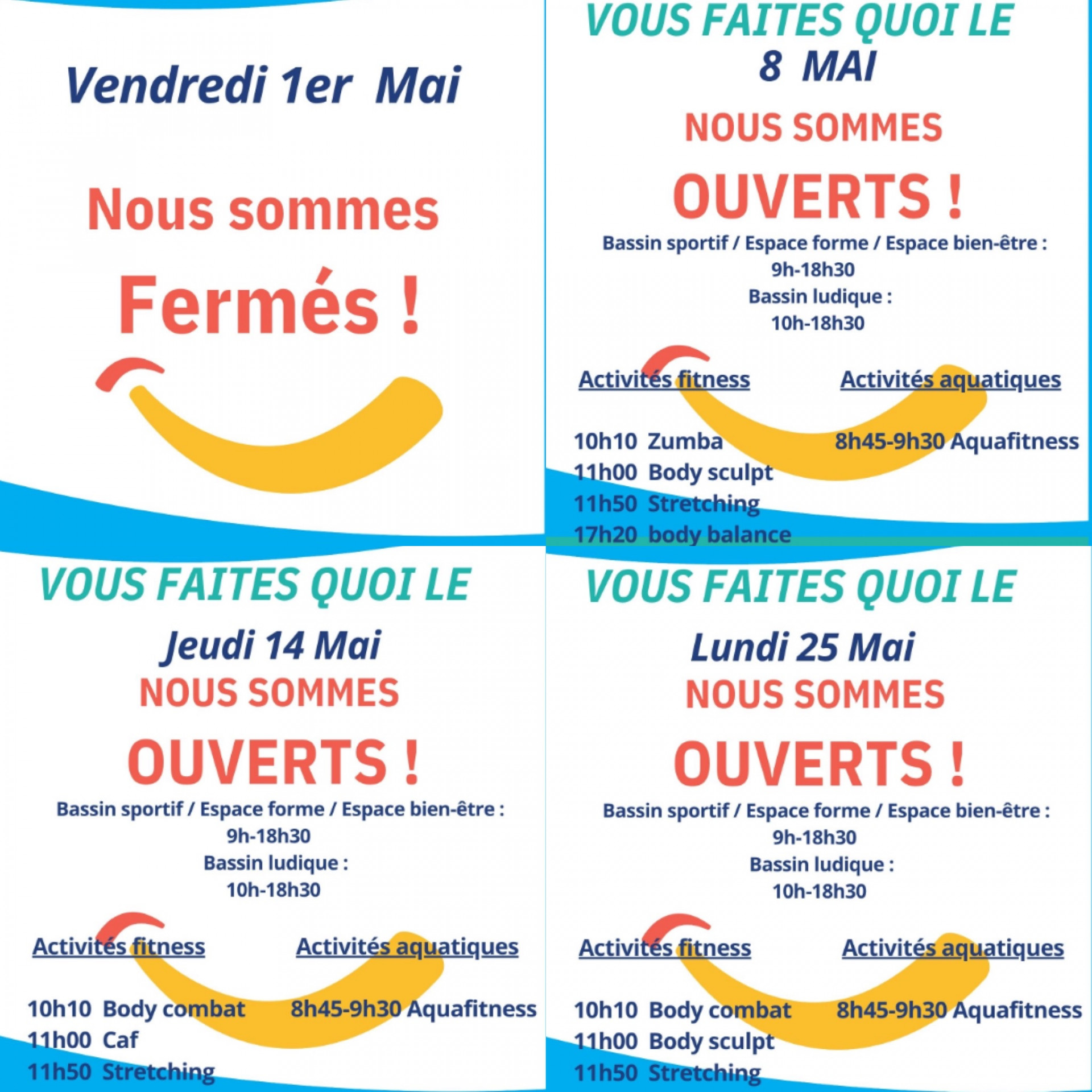 Bassin sportif : 09:00 - 18:30 | Bassin ludique : 10:00 - 18:30 | Fitness : 09:00 - 18:30 | Bien-être : 09:00 - 18:30