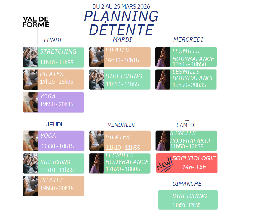 Découvrez également la sophrologie à Val de Forme, avec des séances proposées les samedis 7, 14, 21 et 28 mars à 14h. 🗓️